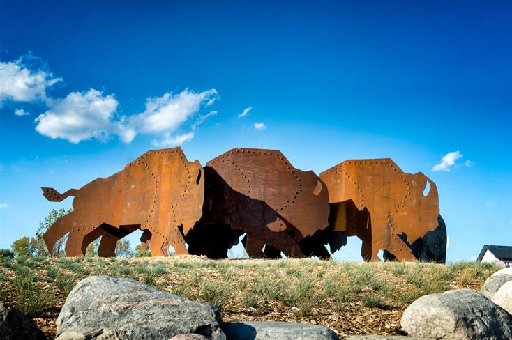 David MacNair, a long-time Manitoba artist, was inspired by the history of the natural land in RidgeWood West and worked with a talented team to create the first roundabout sculpture consisting of five bison, weighing 1,820 pounds each, made of weathering steel that will turn into a beautiful dark brown rust colour.